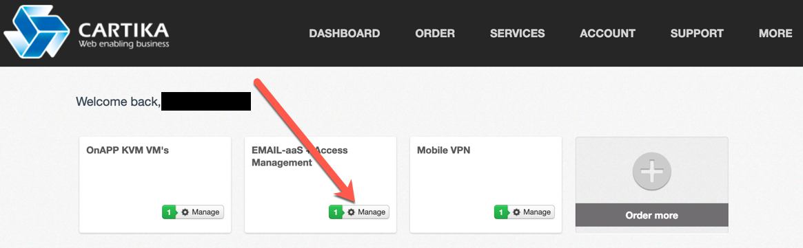 To create an account on our cloud email platform, first login to your Cartika Client Area and click on the "EMAIL-aas + Access Management" service.