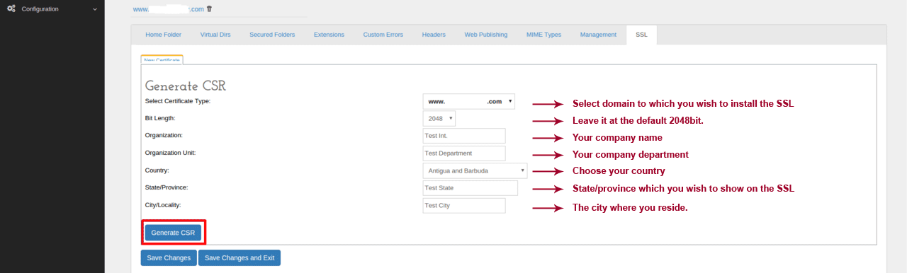 6. Fill in the form on the next window and click Generate CSR.