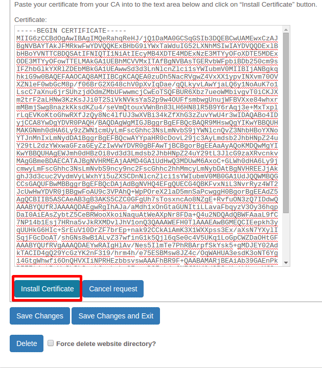 8. To install the certificate simply copy/paste the certificate into the blank space and click Install Certificate.